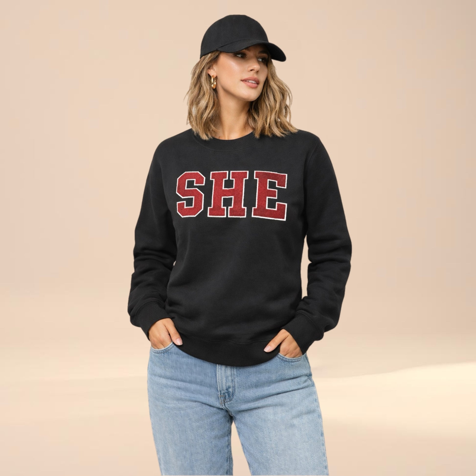 CRAFTED FROM AN ULTRA-SOFT, THICK COTTON BLEND, IT OFFERS THAT PERFECT BALANCE OF WARMTH, COZINESS, AND STRUCTURE. THE STANDOUT DETAIL — SOFT CHENILLE “SHE” PATCHES EMBROIDERED ACROSS THE FRONT — REMINDER READS: “STRONG. HONEST. EMPOWERED.” — A SUBTLE NOD TO THE WOMAN WHO WEARS IT.